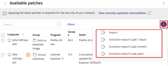 Use the context menu to export the data. You can download a detailed file that includes all data in the list or a reduced version. In either case, the file contains information about the patches installed in the selected time period.