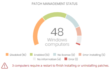 Shows computers where Cytomic Patch is working correctly and computers where there have been errors or problems installing or running the module. The status of the module is represented with a circle with different colors and associated counters. The panel provides a graphical representation and percentage of computers with the same status.