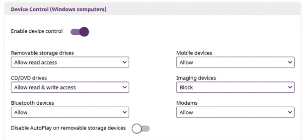 Llaves USB y unidades CD/DVD: elige entre Bloquear, Permitir lectura o Permitir lectura y escritura.