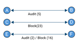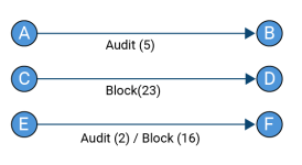 Diagrama (5): representación gráfica que utiliza nodos y flechas para mostrar las conexiones entre los equipos y su dirección. También indica la acción que el control de acceso a endpoints llevó a cabo sobre las conexiones, y a cuántas conexiones afectó dicha acción. Consulta Características de los nodos y las conexiones.