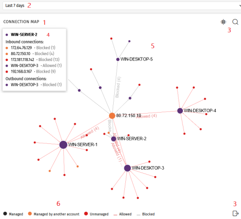 Leyenda (6): sistema de colores para mostrar equipos administrados y no administrados, y líneas de las conexiones autorizadas y bloqueadas.