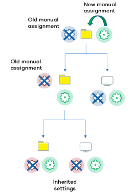 Manually assigned settings take precedence over inherited settings. When you manually assign a new settings profile to a group, all computers and devices below that group use the manually assigned settings, not the inherited or default ones.