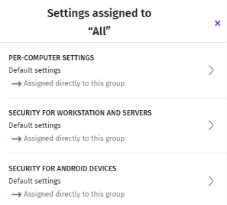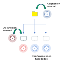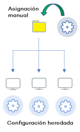 La asignación de configuración es manual sobre el grupo padre y todos sus descendientes (equipos y otros grupos con equipos en su interior) reciben la configuración de forma automática.
