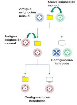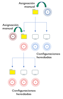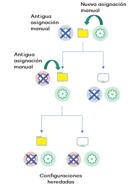 La configuración asignada a un grupo (manual o heredada) se propaga a todos los elementos de la rama del árbol hasta que se encuentra una asignación manual.
