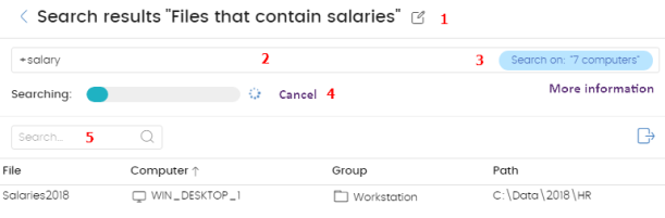 • El número máximo de resultados por cada equipo es 10.000 / número de equipos sobre los que se ejecuta la búsqueda. De esta forma, si se busca sobre un parque de 100 equipos, el número máximo de resultados mostrados será 10.000 / 100 = 100 resultados por equipo.