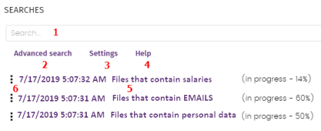 Una vez creada una nueva búsqueda, ésta aparecerá en el widget Búsquedas con la fecha y hora de su creación, junto al nombre y una leyenda indicando su estado (En curso, Cancelada) o sin estado (Finalizada).