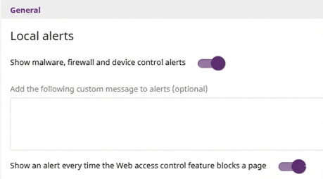 To Show malware, firewall, and device control alerts on protected computers and devices, enable the toggle. Advanced EPDR shows the user a pop-up notification with the reason for the alert.