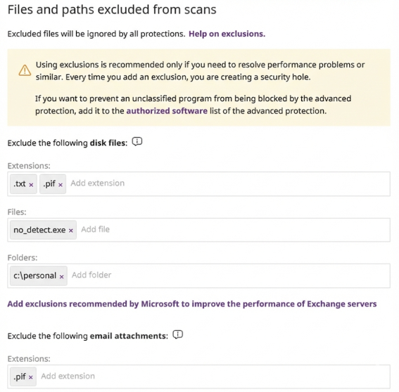 This section enables you to disable protection for the specified files and file paths. We recommend that you only exclude files and paths to resolve performance problems.
